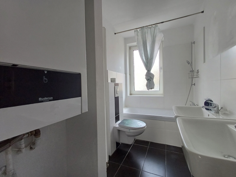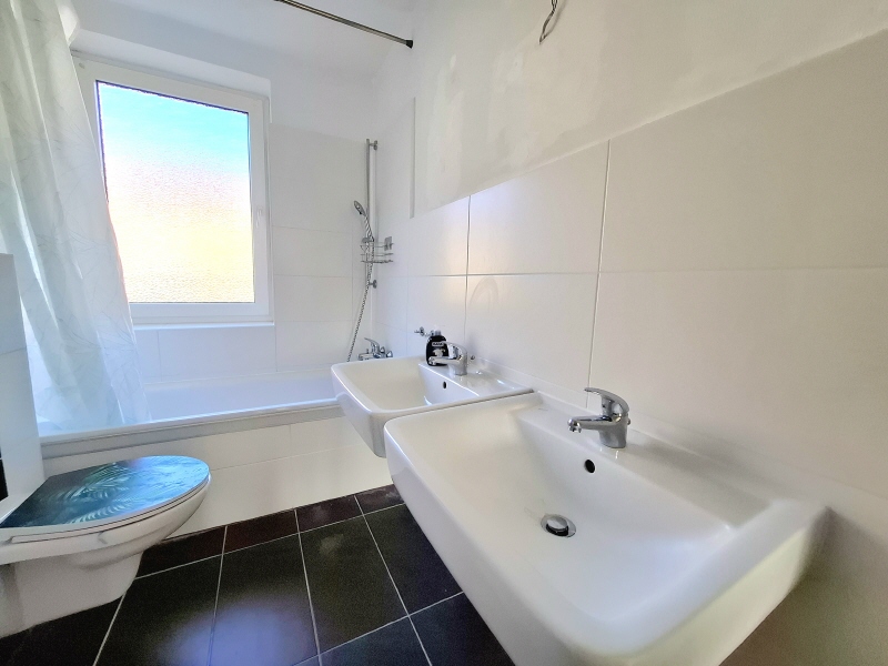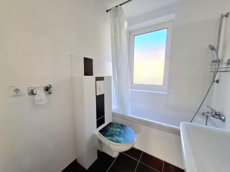 - Die Wohnung verfügt über ein modernes Bad mit Dusche und Fenster
