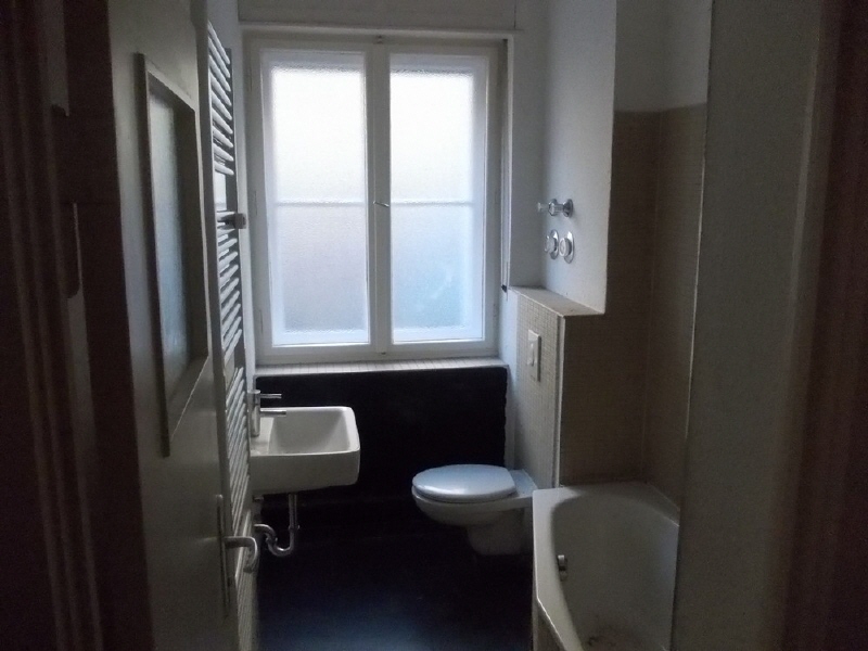 - modernes Wannenbad mit Fenster und Handtuchheizkörper