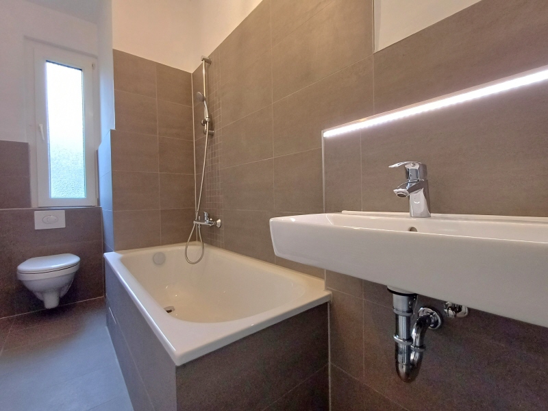 - Das Badezimmer ist mit Badewanne und Fenster ausgestattet